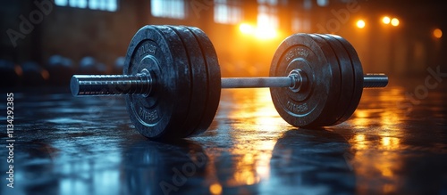 Weightlifting barbell on gym floor.