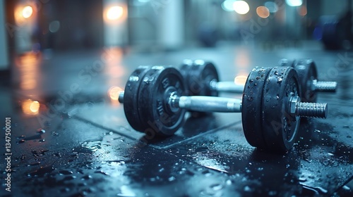 Weightlifting dumbbells a gym floor dramatic lighting with ample negative space