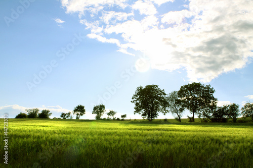 wheat, field, countryside, peasant, cornfield, countryside, meadow, green, grain, tree, tree, heaven, blue, white, sunset, summer, vacation, culture, yellow, evening