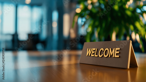Welcome sign on table in office, creating warm atmosphere for visitors. inviting message enhances professional environment, making it feel friendly and approachable