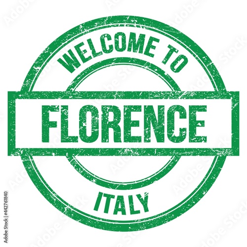 WELCOME TO FLORENCE - ITALY, words written on green stamp