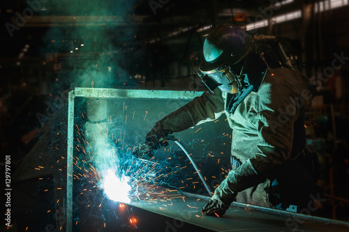 Welder of Metal Welding with sparks and smoke in manufacture