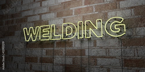 WELDING - Glowing Neon Sign on stonework wall - 3D rendered royalty free stock illustration. Can be used for online banner ads and direct mailers..
