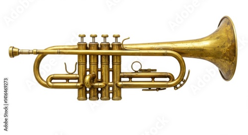 Well worn brass trumpet with a golden patina, showing signs of age such as tarnished spots and subtle scratches