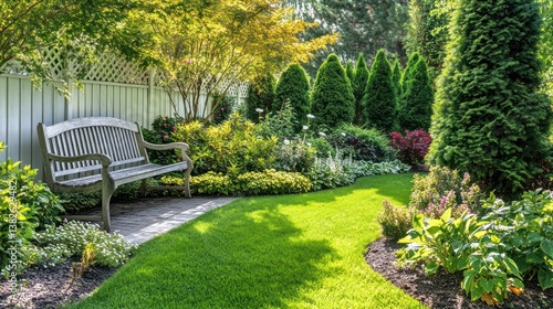 garden, backyard, landscaping, relaxing, bench, flower, tree, lawn, nature, peaceful, scenic, beautiful, plant, shrub, decorative, design, summer, spring, tranquil, green, cosy, home, patio, sunlight, stone, greenery, ornamental, detail, neat, neatly, maintenance, relax, seating, aesthetic, honed, view, garden, landscape
