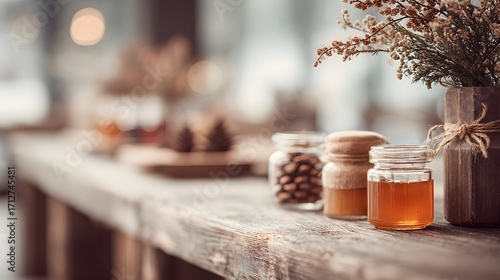 Wellness café interior blurred rustic counter with jars of honey and dried herbs