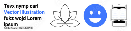 Wellness, emotional health, education, digital reading, mindfulness, nature. Black outline of a leaf, blue happy face and open book on a smartphone. Wellness and emotional health concept