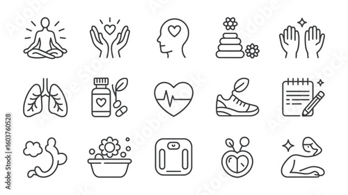 wellness, lifestyle, icon, black, line art, graphic, collection, yoga, meditation, heart rate, lung, supplement, fitness, notebook, exercise, mindfulness, healthy living, well-being, vector, illustration, health care