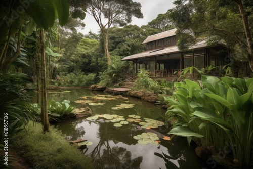 wellness retreat with view of tranquil pond, surrounded by lush greenery, created with generative ai
