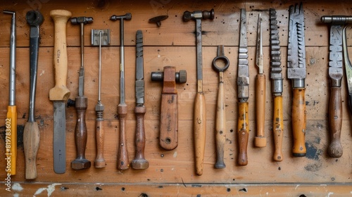 Well-Used Tools, Close-up of sculpting tools neatly arranged on a wooden workbench, Highlighting worn handles