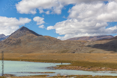Western Mongolia mountainous landscape. View at Tsaagan Gol River, White River. Altai Tavan Bogd National Park, Bayan-Ulgii Province, Mongolia.