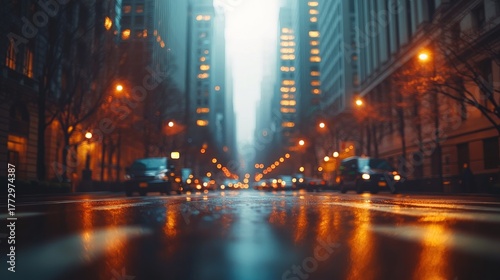 wet, city, street, dusk, reflecting, glowing, light, vehicle, urban, night, rainy, blurred, atmospheric, traffic, city landscape, dark, moody, modern, building, window, street light, pavement, asphalt, road, driving, commuter, travel, transport, movement, illuminated, perspective, depth, abstract, impressionistic, bokeh, atmosphere, ambient, glow, shimmer, shine, wetness, water, droplet, reflections, urbanity, evening, metropolitan, journey, passage