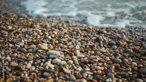 Wet pebble beach scene with rounded stones in multiple colors from erosion, serving as a natural background for text or layout