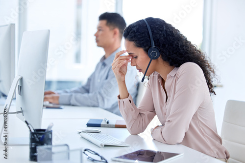 What is so difficult to understand. Shot of a young call centre agent sitting with her colleague and feeling stressed while using her computer.