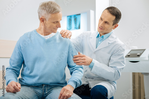 What should I do. Pleasant nice senior man sitting on the bed and looking at his arm while listening to doctors instructions