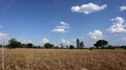 field, landscape, sky, agriculture, summer, wheat, nature, blue, cloud, rural, farm, cloud, grass, countryside, meadow, harvest, tree, yellow, green, crop, tree, farming, land, plant, straw