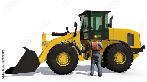 Wheel loader bulldozer and cosntruction worker isolated