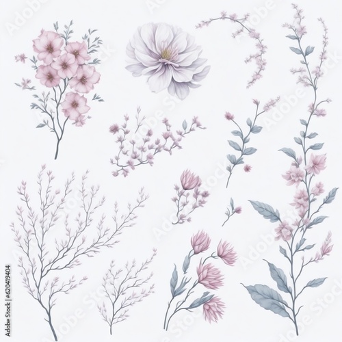 "Whimsical Blooms: Minimal Watercolor Collection of Sakura Floral Decorations on White"