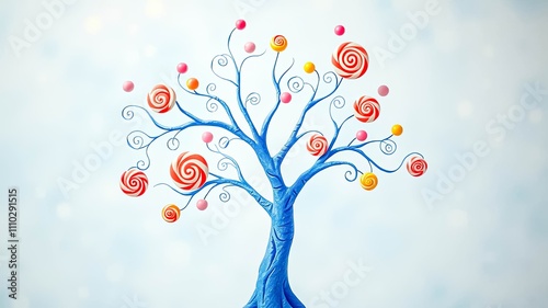 Whimsical blue tree adorned with vibrant spiral lollipops and colorful candy balls against a soft, light blue backdrop