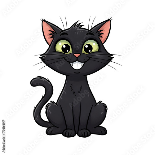 Whimsical cartoon black cat illustration with bright green eyes and a wide grin, perfect for playful designs and charming themes