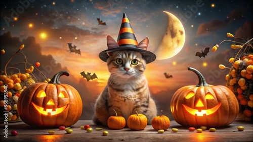 Whimsical cat in a witch's hat, surrounded by candy corn, jack-o-lanterns, and a crescent moon glow, in a sweet and serene Halloween scene