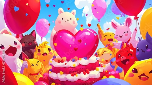 Whimsical Celebration with Cute Cartoon Animals Balloons and Heart Shaped Cake Against Blue Sky