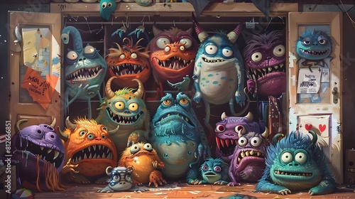 monster, creature, cartoon, cute, funny, colourful, toy, collection, strange, surreal, whimsical, bizarre, fantasy, imaginative, playful, quirky, odd, unusual, unique, eclectic, assortment, display, shelf, cabinet, showcase, horror, scarey, skittish, eerie, creepy, monstrous, weird, crazy, silly, adorable, plush, fluffy, furry, soft, huggable, endearing, humorous, comical, zany, magical, mystical, supernatural