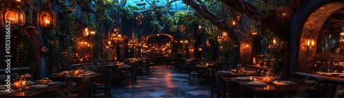 Whimsical culinary realm, illuminated by ethereal lighting, fantastical landscapes merging with delectable dishes, captivating ambiance