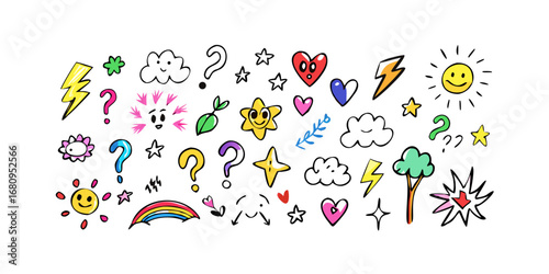 doodle, collection, whimsical, playful, colourful, lightning bolt, sun, smiley face, nubes, star, question mark, rainbow, flower, leaf, tree, abstract, graphic, isolated, cut-out