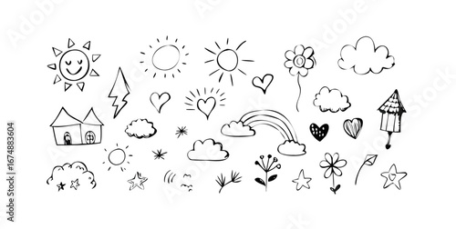 doodle, vignetting, drawing, simple, black, white, outline, sun, cloud, nubes, house, rainbow, flower, star, lightning, bird, nature, weather, cute, childish, whimsical, graphic, design, illustration