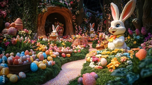 Whimsical Easter festival featuring colorful displays and enchanted scenes