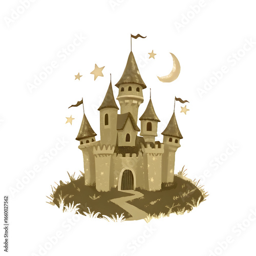 Whimsical fairytale castle with stars and moon, charming children’s fantasy illustration