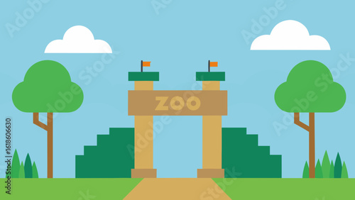 whimsical, flat, cartoon, zoo, entrance, playful, signs, lush, tree, animal, inviting, charming, unique, delightful, children, friendly, fun, adventure, exploration, discovery, wildlife, habitat, conservation, cheerful, vibrant, cute, happy, character, animated, digital, art, sweet, imaginative, educational, family, attraction