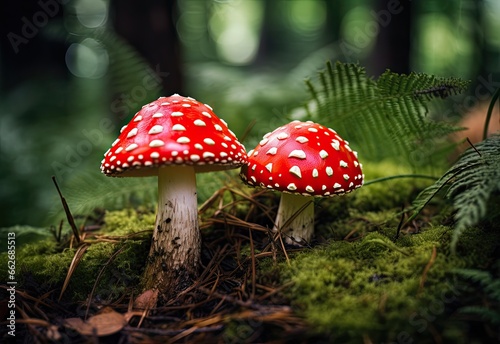 mushroom, toadstool, nature, forest, timberland, moss, fly agaric, red, spotted, fungal, wild, magical, bokeh, closeup, detailed, outdoors, mycology, fresh, growth, environment, vibrant, ecosystem, fairy tale, fantasy, cap, stem, toxic, poisonous, green, dew, moisture, flora, biodiversity, macro, serene, mystical, wilderness, generative, ai