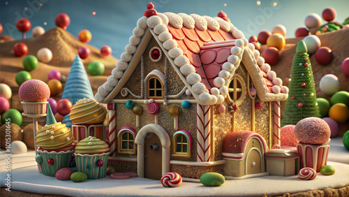 Whimsical gingerbread house with candy decorations in a fantasy candyland.