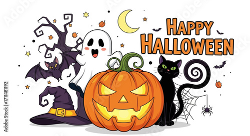 halloween, skittish, ghost, pumpkin, cat, bat, sorcerer, hat, spider's web, moon, star, night, greeting, holiday, celebration, cute, cartoon, funny, festive, scarey, orange, black, autumn, october, joy, fun, playful, whimsical, illustration, traditional, seasonal