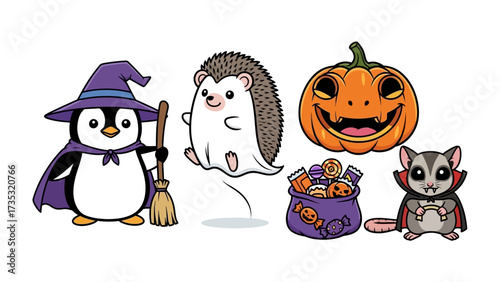 Whimsical Halloween Crew: Adorable cartoon characters dressed for Halloween festivities, including a penguin wizard, hedgehog ghost, smiling pumpkin, candy bag, and bat.
