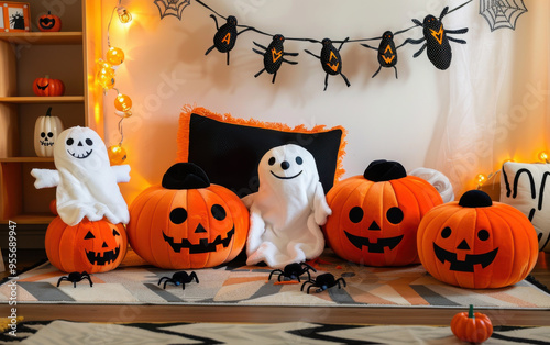 Whimsical Halloween decorations for kids featuring plush pumpkins and ghost plushies in a cozy room