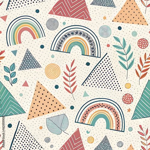 Whimsical Kids Pattern with Triangles, Rainbows, Leaves and Dots – Seamless Background