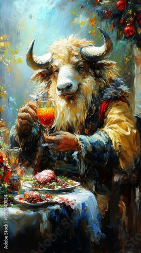 painting, bearded man, drink, serving, whimsical, bull
