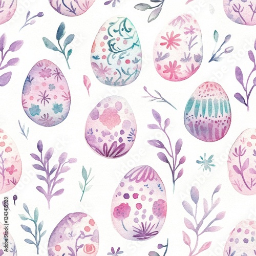 Whimsical pastel watercolor pattern of intricately designed Easter eggs with floral elements in a playful doodle style