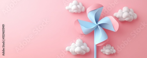 Whimsical pink and blue paper pinwheel with white clouds on pastel background