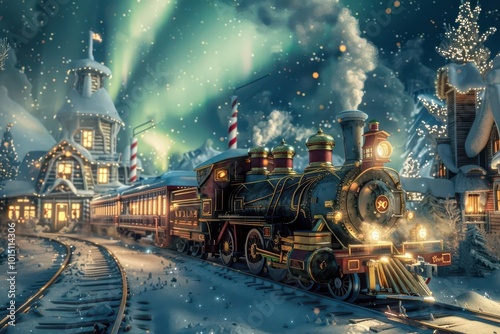 whimsical steampunk christmas train chugging through snowy nordic village, brass gears and candy cane smoke stacks, surrounded by aurora borealis