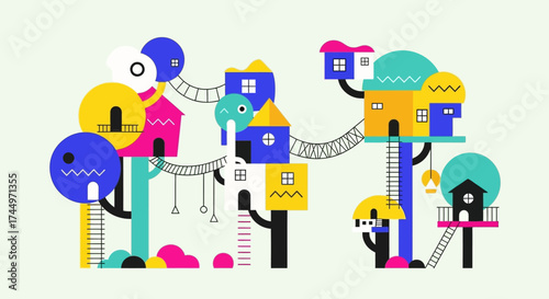 treehouse, village, colourful, abstract, playful, whimsical, illustration, architecture, design, fantasy, childhood, imagination, creativity, fun, bright, vibrant, modern, geometric, shape, structure, house, home, dwelling, community, connection, bridge, platform, nature, tree, foliage, growth, organic, art, graphic, vector, flat, style, minimalist, simple, clean, composition, pattern, background, scene, setting, environment, dream