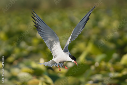 Whiskered Tern - Chlidonias hybrida in flight with spanned wings at green background. Photo from Danube Delta in Romania.