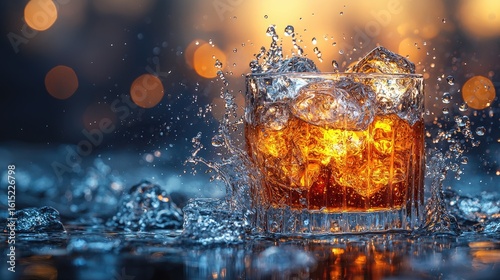 whiskey, ice, splash, drink, glasses, amber, liquid, cool, crystal, iced, brown, water, frost, bubble, texture, liqueur, cocktail, chill, delicious, refreshing, sparkle, vibrant, gold, dark, night, warm, light, background, bokeh, blur, sharpened, closeup, detail, wet, sparkling, frosting, splashing, refreshment