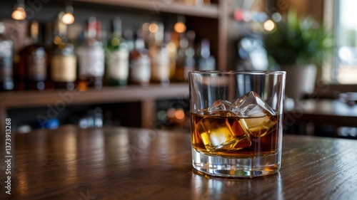 Whiskey in a glass with ice sits on a wooden table in a cozy bar setting during the evening hours