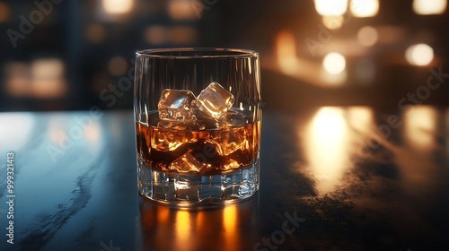 Whiskey on the Rocks in a Glass with Ice Cubes on a Bar Table