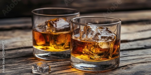 Whiskey on the rocks in clear glass tumblers with large ice cubes resting on a dark rustic wooden table background with warm amber tones
