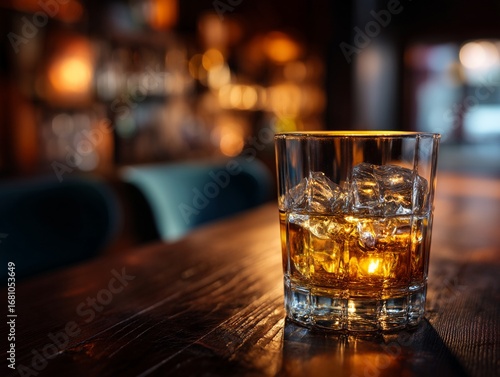 Whiskey on the rocks in glass on wooden bar top at night close up drink shot